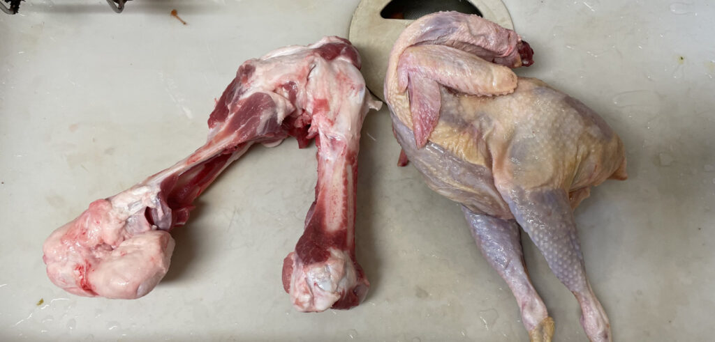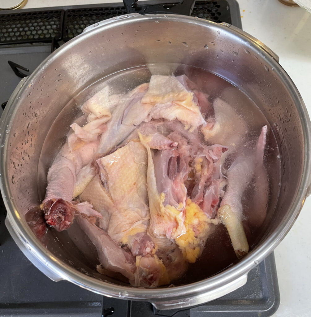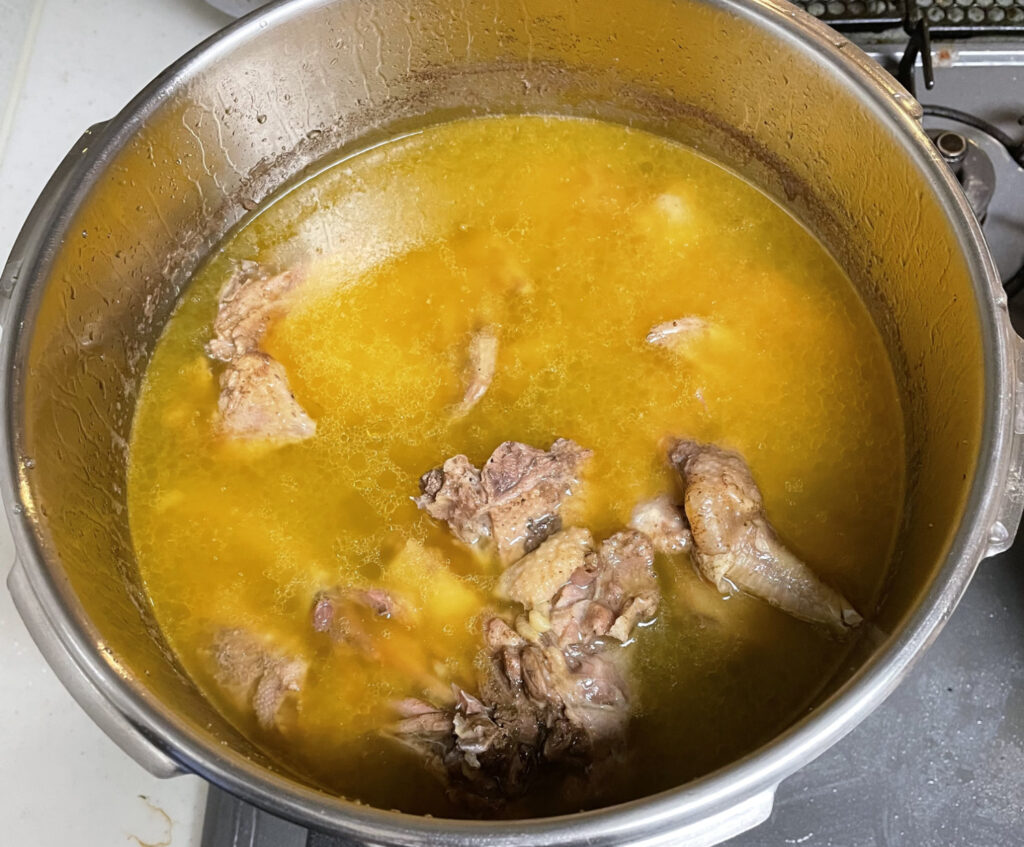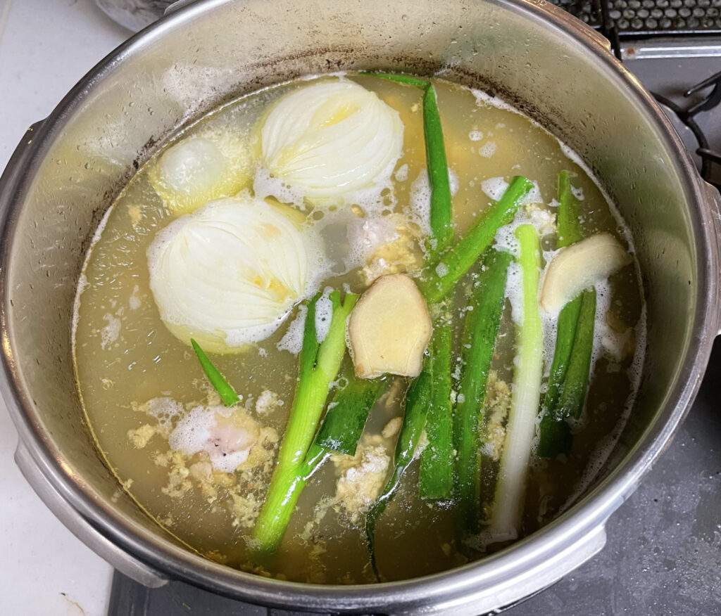 豚のゲンコツはハンマーで割り、丸鶏は解体して、鶏ガラ部の背中についた肝などを綺麗に掃除します。それをすべて、6リットルの圧力鍋に入れ、水を2リットル入れたら点火します。沸騰するまでは強火。