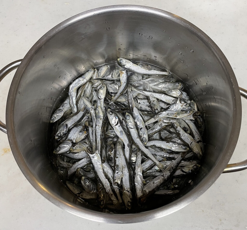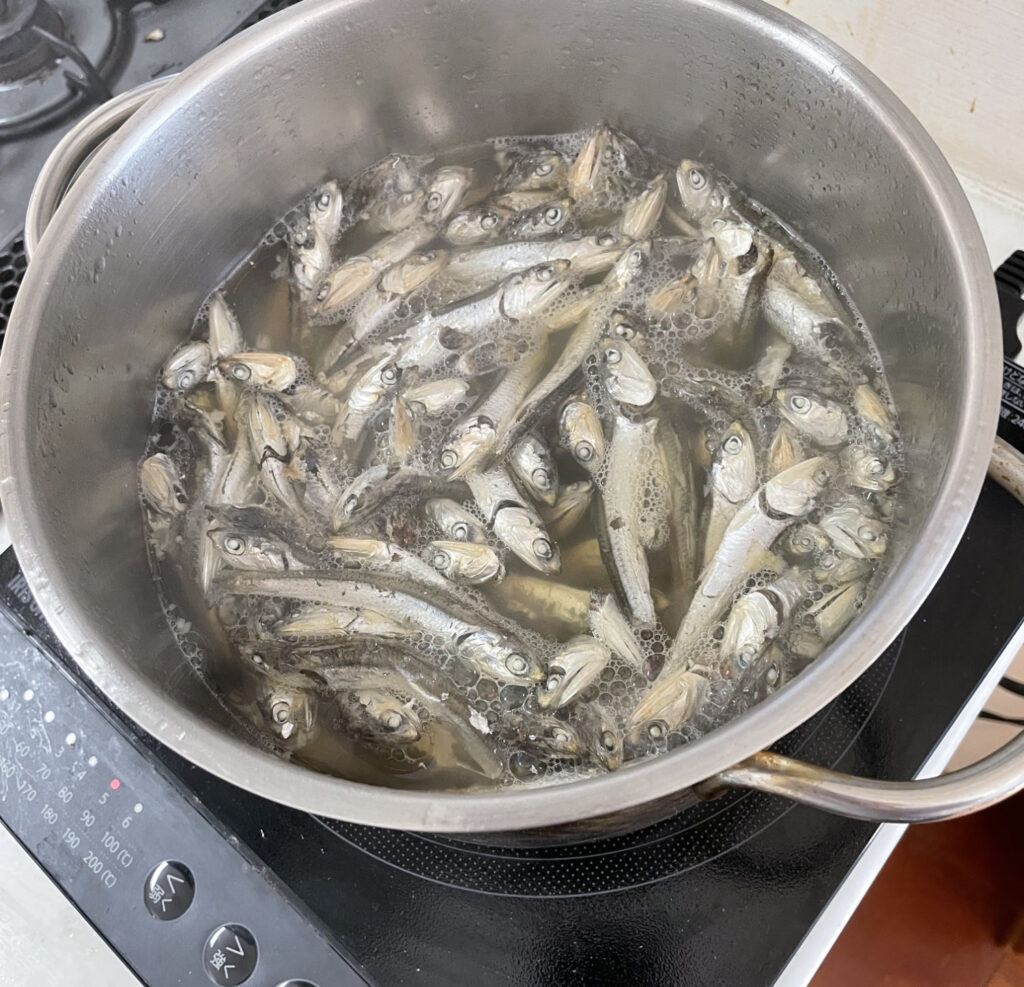 煮干し全量と水1000ccを鍋に入れて、一晩そのまま放置(水出し)します。