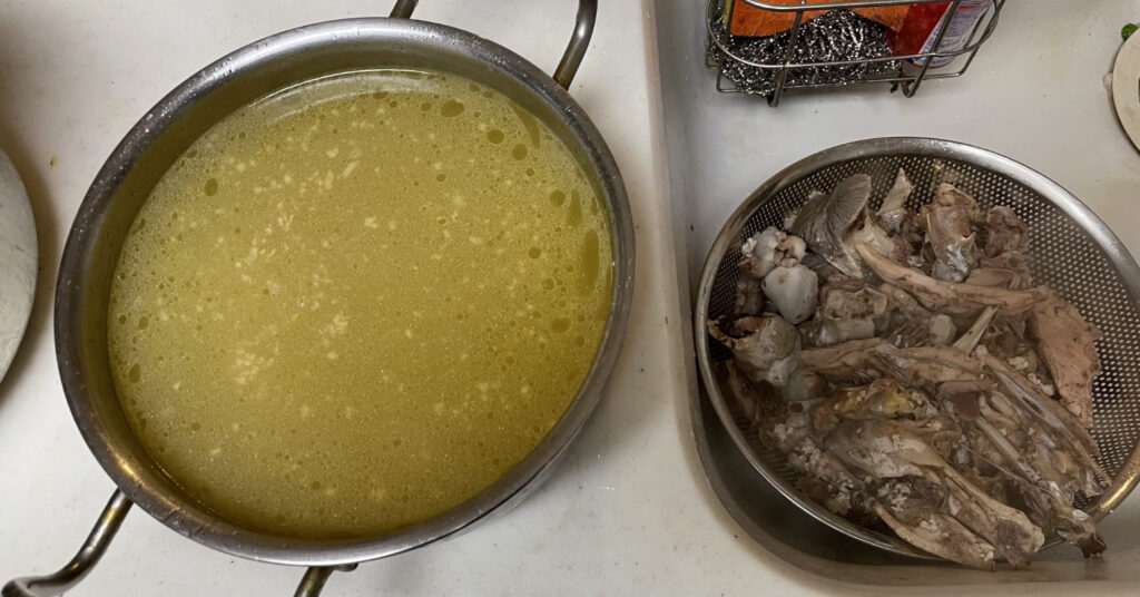 2時間後一旦完成。ザルで越します。煮干しの水分と旨みを余すことなく搾り取るため、ボウルなどを使ってぎゅーぎゅーとスープを搾り取ります。