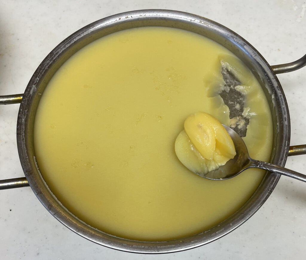再度火にかけると液体に戻ります。完成。出来高1800ccになるように、蒸発してる場合は水で調整しましょう。
