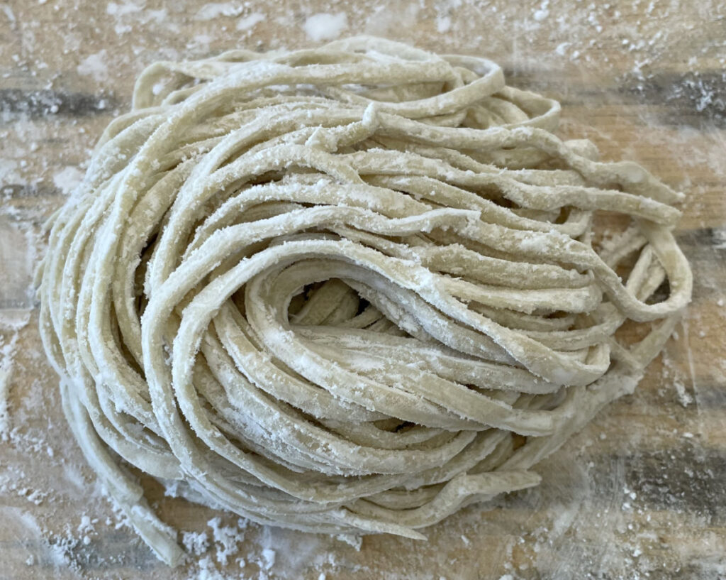 打ち上がった麺は、打ち粉してから手で全力で揉んで、ちぢれ麺にします!