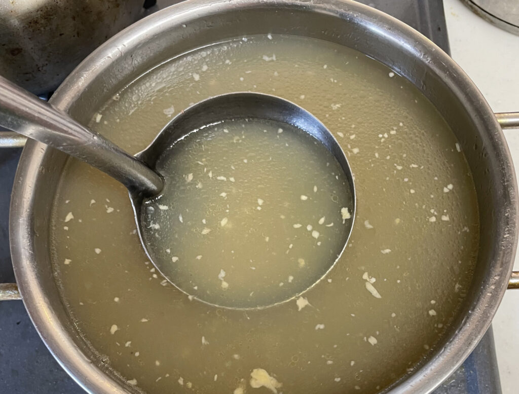 背脂煮干しそばのスープはとにかく手間暇かけて作るのがポイント。まずは動物系スープから取り掛かります。一度冷やして油を取り除く工程が含まれるので、ラーメンを食べる前日に準備しておく必要があります。