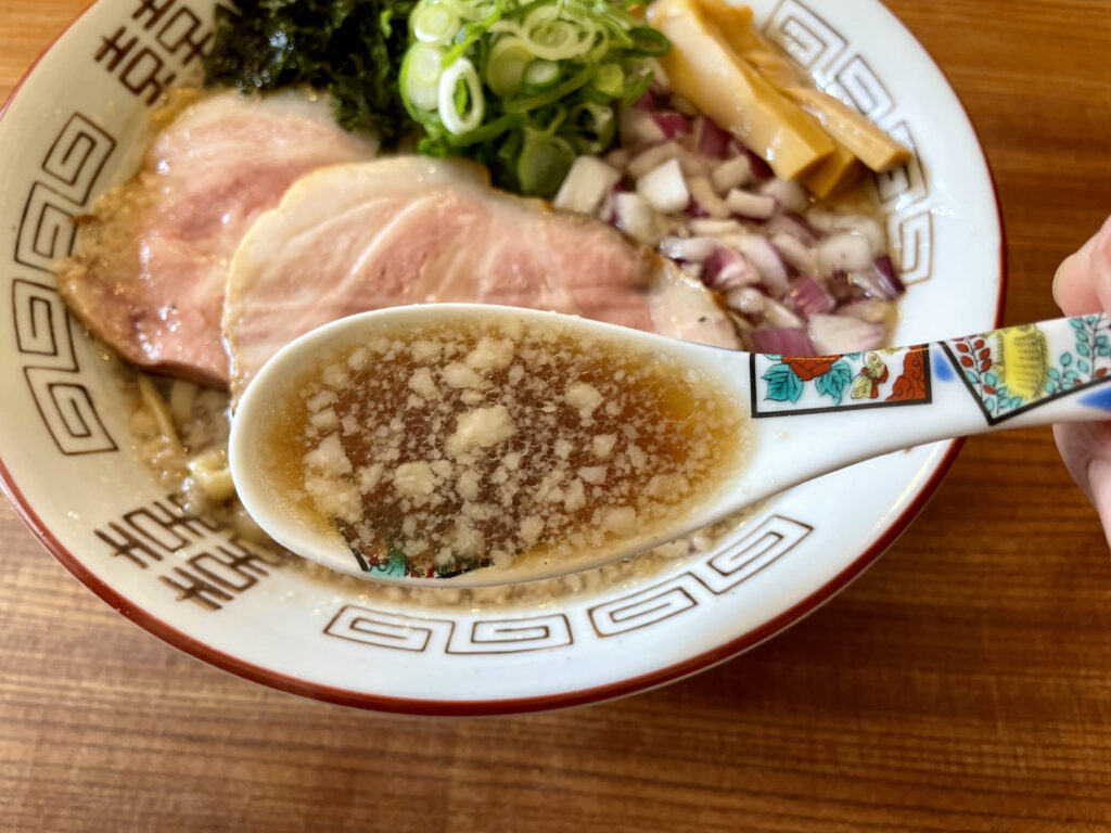 うーん!濃い煮干しスープの中にしっかりとした動物系の旨みも感じる、複雑な味わい。美味しい!こんだけ背脂入れて大丈夫なのかと思いきや、魚介の旨みの中に背脂の甘さも感じてすごく美味しい!意外と飲みやすいです。