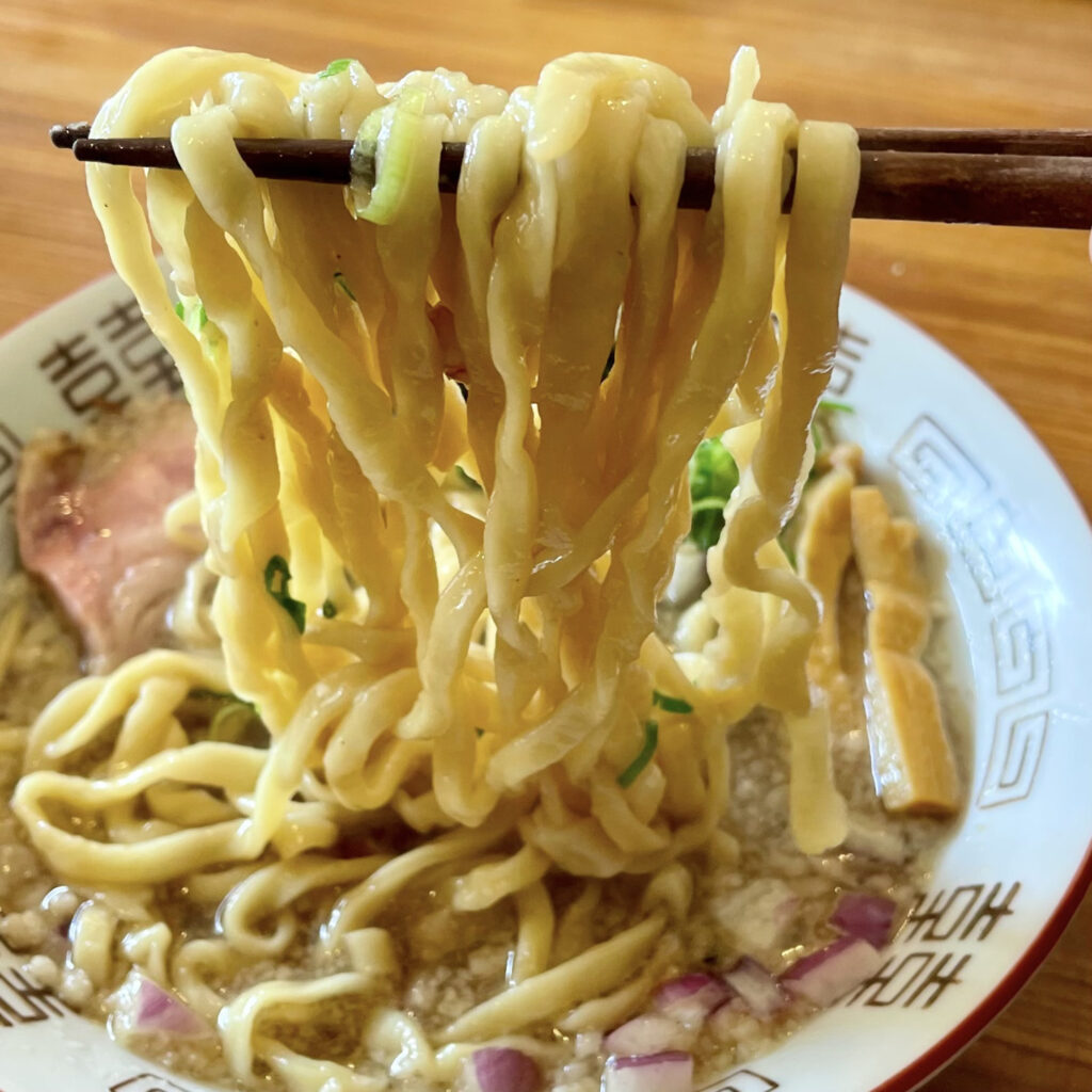 そして麺!スープをしっかりと吸い、モチモチのツルツルで非常に美味しいです。しっかり目に茹でるのがポイントな気がします。パンチがあるのにスルスルと啜れます。